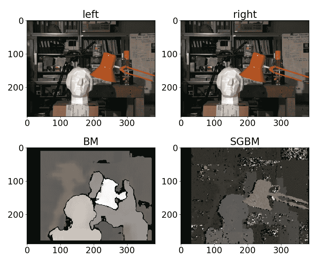我们使用两种不同的算法进行视差图计算-块匹配和半全局块匹配。 在使用cv2.StereoBM_create或cv2.StereoSGBM_create(在其中指定最大可能视差)实例化映射估计对象之后,我们调用compute方法,该方法将获取两张图像并返回视差图。