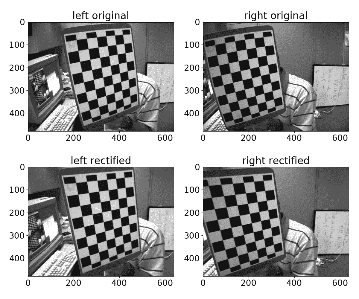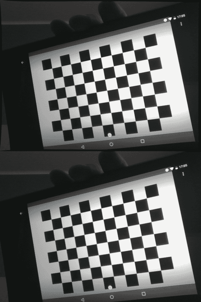 - 加载相机矩阵,畸变系数和同一平面对象(棋盘图案)的两张照片。 然后,取消扭曲照片:
