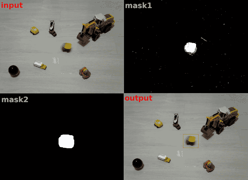 mask1是我们的减法器提取的前景遮罩。mask2是已除去噪声的前景遮罩。- 输出是绘制矩形的帧。
