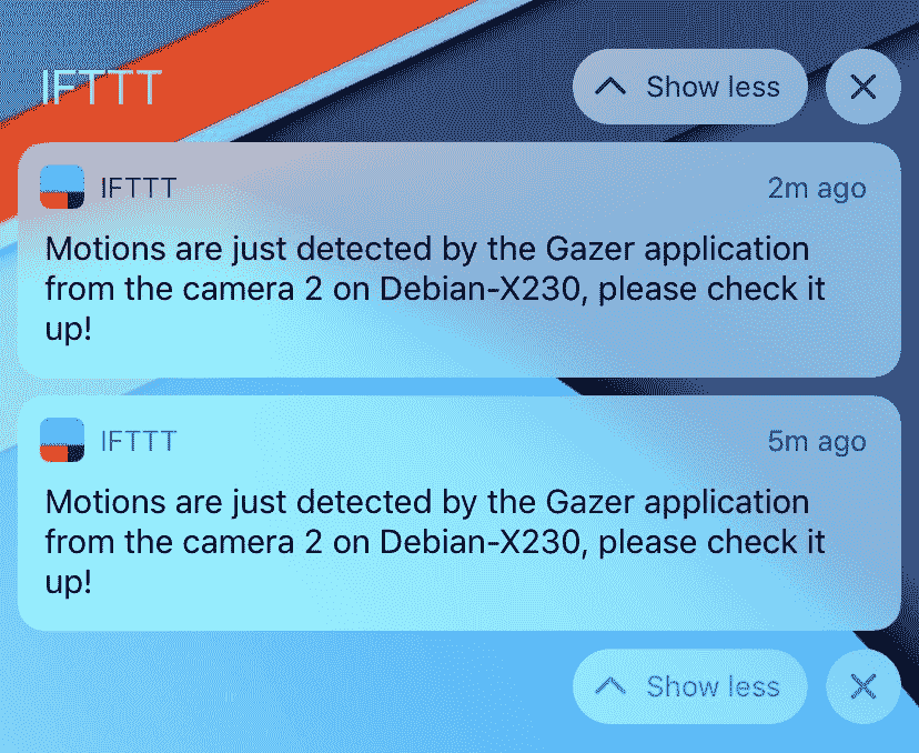 现在,我们将编译我们的项目并运行该应用,然后在手机上安装 IFTTT 应用。 当检测到运动时,将会在我们的手机上收到通知。 我的看起来像这样:
