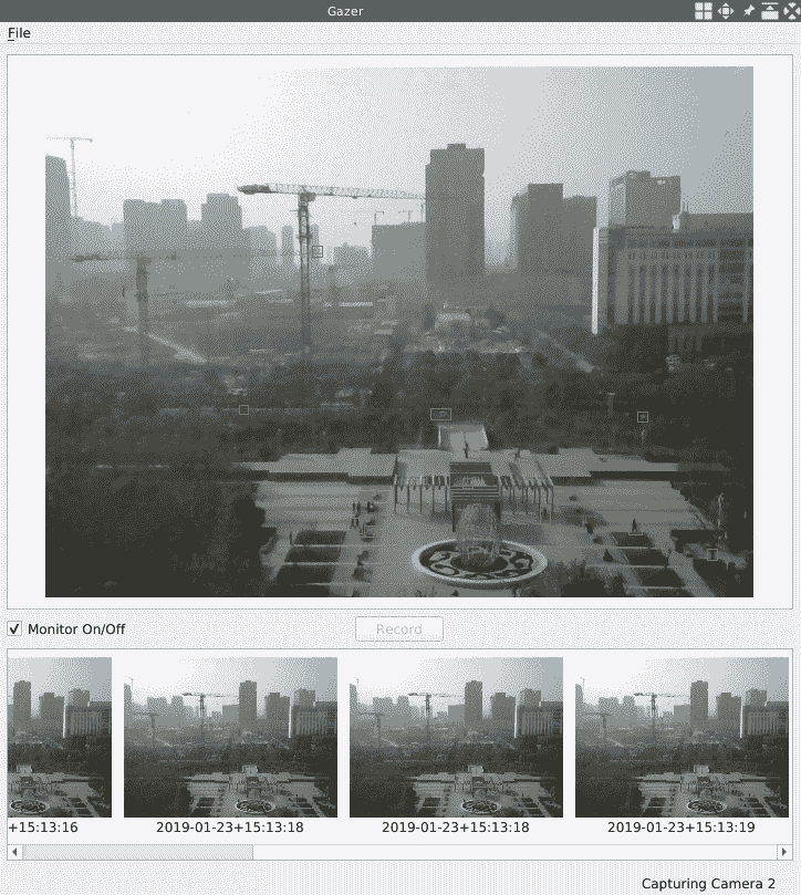 在前面的代码中,如果在最后一帧中未检测到运动,但在当前帧中检测到一个或多个,则可以说检测到新的运动; 然后,我们可以开始从摄像机录制视频,并告诉某人正在发生事情。 另一方面,当在当前帧中未检测到运动但在最后一帧中检测到一个或多个运动时,可以说运动已经消失,因此停止录像。