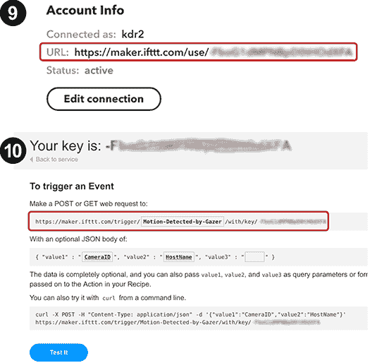 转到 IFTTT 上的 Webhook 服务的设置页面。 您可以通过在浏览器中访问这个页面来找到该页面。 在此页面上,您会找到信息“步骤 9”,如先前的屏幕截图所示。 复制该页面上的 URL 并访问它-您将被导航到类似“步骤 10”的页面。 该页面向我们展示了如何触发网络挂钩。 您可能会注意到此页面上 URL 中有一个文本框。 在其中创建小程序Motion-Detected-by-Gazer时,输入我们使用的事件名称。 这样,您将获得完整的 URL(即 Webhook 的端点)。 看起来像https://maker.ifttt.com/trigger/Motion-Detected-by-Gazer/with/key/-YOUR_KEY。 请记住该端点,因为我们将很快对其发出 Web 请求。