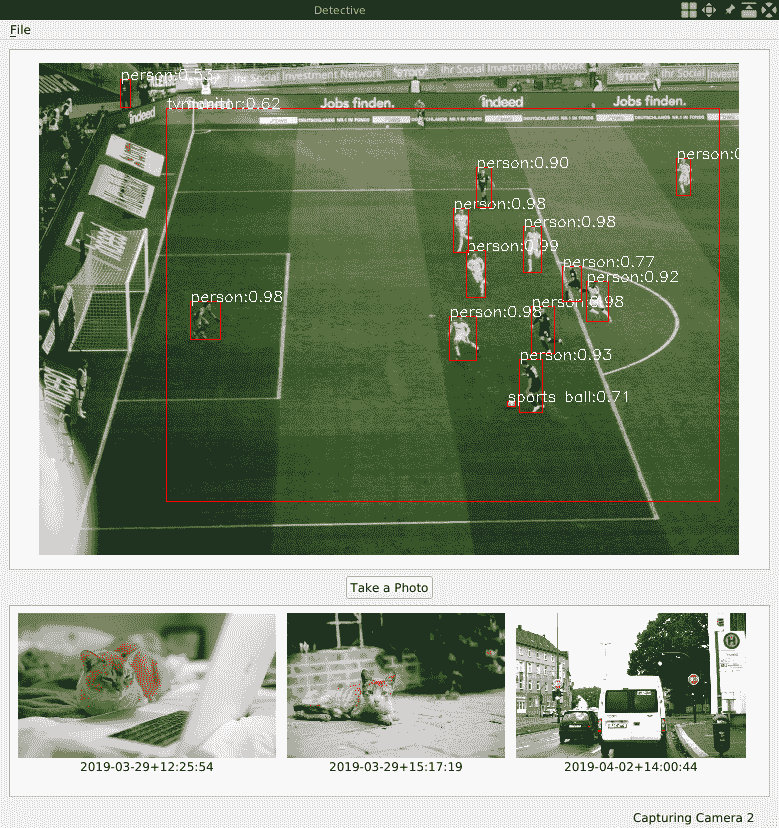 如您所见,YOLO 在对象检测方面确实做得很好。 但是仍然有一些错误的预测。 在第一个屏幕截图中,YOLO 将我的 iPad 识别为 0.67 的笔记本电脑。 在第二张屏幕截图中,它以 0.62 的置信度将足球场识别为电视监视器。 为了消除这些错误的预测,我们可以将置信度阈值设置得更高一些,例如 0.70。 我将留给您摆弄参数。