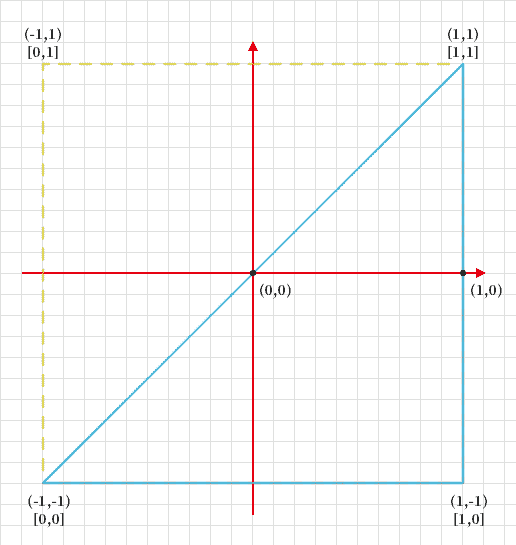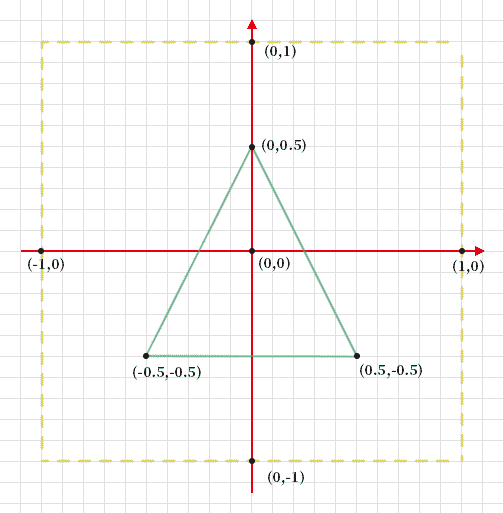 OpenGL 使用称为规范化设备坐标(NDC)的坐标系。 在该坐标系中,所有坐标都限制在 -1.0 和 1.0 的范围内。 如果对象的坐标超出此范围,则它们将不会显示在 OpenGL 视口中。 通过省略z轴,可以通过下图演示 OpenGL 的视口和给出的点(形成三角形):