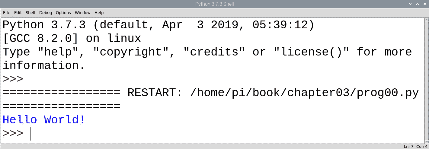 创建与当前章节对应的目录后,将文件另存为prog00.py。 您只需要输入文件名即可; IDLE 将自动为文件分配.py扩展名。 然后,该文件将由 Python 3 解释器执行,并且输出将在解释器外壳中可见,如下所示: